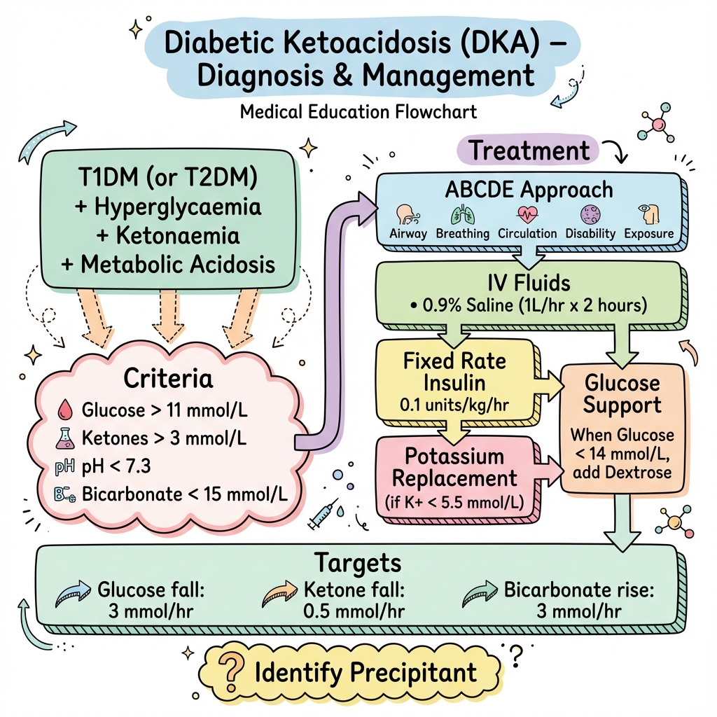 Diabetic ketoacidosis (DKA) is a life-threatening diabetic emergency characterised by the triad of hyperglycaemia, ketonaemia, and metabolic acidosis. It occurs primarily in type 1 diabetes (but can occur in T2DM) due to absolute or relative insulin deficiency. Precipitants include infection, missed insulin, and new diabetes. Treatment follows a protocolised approach: aggressive IV fluids, fixed-rate IV insulin, potassium replacement, and identification of the precipitant. Resolution is defined by ketones below 0.6 mmol/L, pH above 7.3, and bicarbonate above 15.