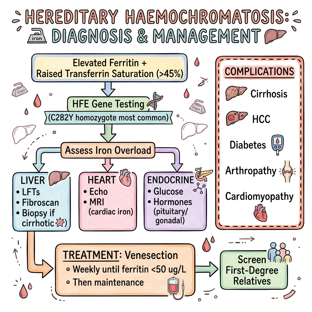 Hereditary haemochromatosis (HH) is an autosomal recessive disorder of iron metabolism resulting in excessive iron absorption and tissue deposition. The most common form is caused by C282Y homozygosity in the HFE gene. Iron accumulates in the liver, heart, pancreas, joints, and endocrine organs, leading to cirrhosis, cardiomyopathy, diabetes, arthropathy, and hypogonadism. Diagnosis is by elevated transferrin saturation and ferritin, confirmed by HFE genotyping. Treatment is venesection (phlebotomy) to remove excess iron. Early diagnosis prevents complications; cirrhosis once established is irreversible.