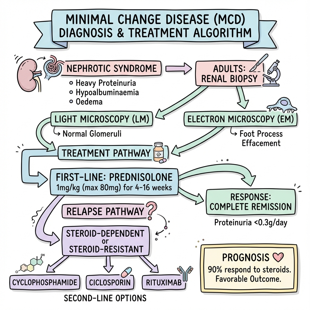 MCD is the paradigm of steroid-responsive nephrotic syndrome. Understanding its management informs approach to all glomerular diseases. Complications of nephrotic syndrome (thromboembolism, infection) require proactive prevention.