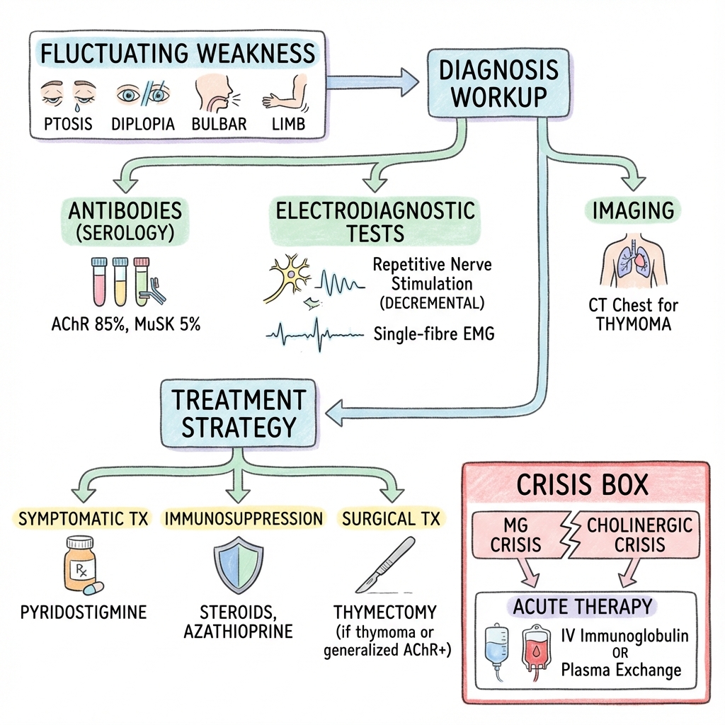 "MG is an autoimmune NMJ disorder with fatigable weakness. 85% have AChR antibodies; 5-10% MuSK. Diagnose with antibodies and RNS/SF-EMG. CT chest for thymoma. Treat with pyridostigmine, steroids (start low), thymectomy (MGTX trial). MG crisis: PLEX or IVIG."