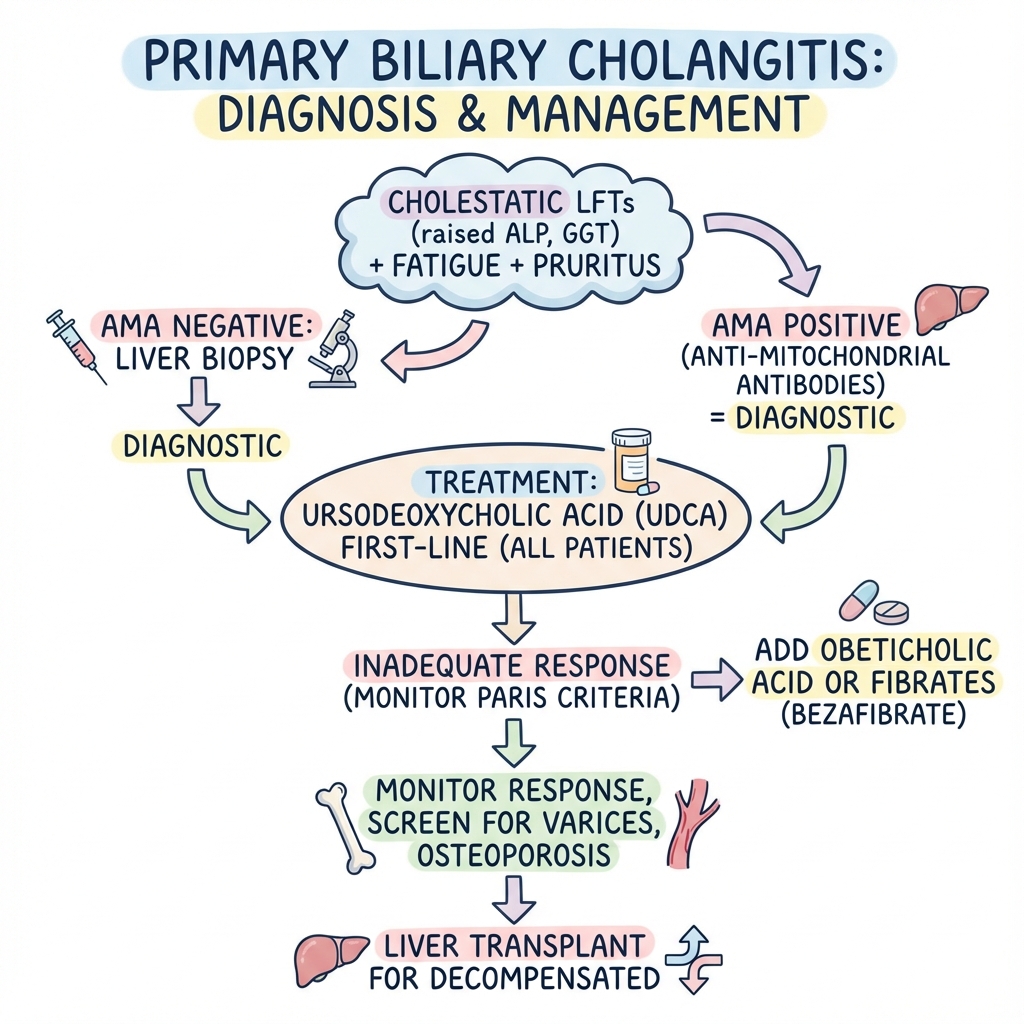 Primary biliary cholangitis (PBC) is a chronic autoimmune cholestatic liver disease characterised by progressive destruction of small intrahepatic bile ducts. It primarily affects middle-aged women and presents with fatigue, pruritus, and cholestatic liver function tests (elevated ALP, GGT). Anti-mitochondrial antibodies (AMA) are highly specific and present in 95% of cases. Ursodeoxycholic acid (UDCA) is the first-line treatment and improves survival. Patients with inadequate UDCA response may benefit from obeticholic acid or fibrates (bezafibrate). Liver transplantation is the treatment for decompensated disease.